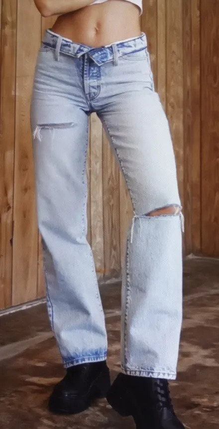 Trendy light blue jeans with distressed details. Straight leg design. Perfect for casual wear. Distr... Show more