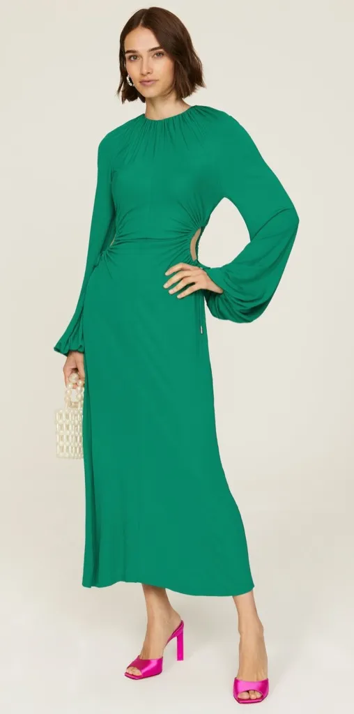 REBECCA VALLANCE 70s Ruched Tie Waist Cutout Long Bell Sleeve Disco Midi Dress 8