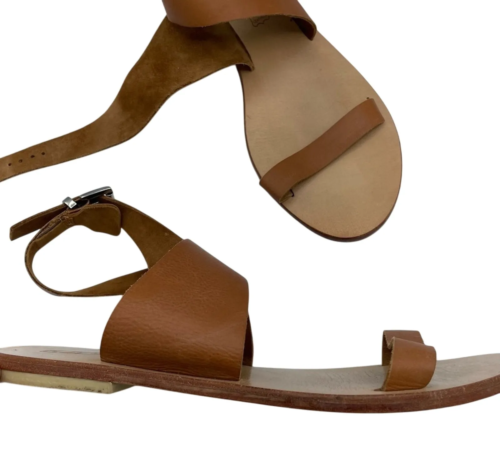Revolve Sol Sana Tan Leather Minimalist Sandals 40 Preowned in excellent condition minor wear see photos Hard to photograph without a foot in them but the back leather piece wraps around the ankle and buckles