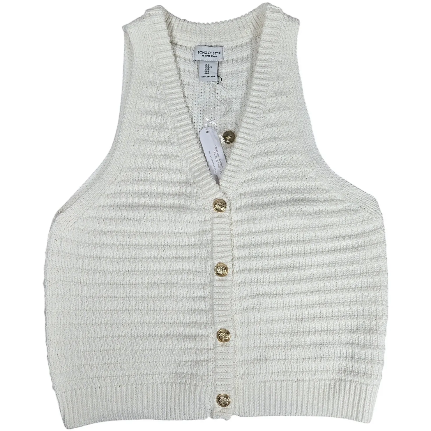 Song of Style by Aimee Song Lady Knit Sweater Tank Vest L NWT New with tags. Size: L 68% Polyester, 20% Cotton, 12% Acrylic Machine wash V-Neck Extra Button Included Knit Gold detail buttons Measurements are in the photos.