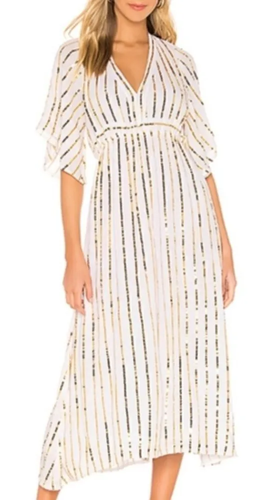 Self: 100% viscose Lining: 100% cotton Dry clean only Fully lined Sequin embellishment throughout Drawstring waist Back tie closure Imported Revolve Style No. SDRE-WD38 Manufacturer Style No. S19009 One size fits most Great preowned condition. 0555-37