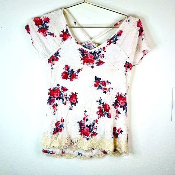 Measurements: Length: 23” Chest: 15.5” stretch to 20” Description: This charming Rewind top in size XS features a delicate floral print with vibrant red and navy blooms on a soft ivory background. The romantic lace trim along the hem adds a touch of vintage-inspired elegance, while the crisscross detail at the back elevates its unique boho style. Perfect for casual outings, this lightweight top pairs beautifully with jeans, skirts, or shorts for a cottagecore or shabby-chic vibe. Pre-loved and in great condition, ready to be a statement piece in your wardrobe! Key Features: - Brand: Rewind - Size: XS - Color: Ivory with red and navy floral print - Features: Lace trim, crisscross back, cap sleeves - Style: Boho, cottagecore, romantic - Material: 92% Rayon/8% Spandex - Condition: Pre-Owned Good Condition Ships quickly with care from a smoke-free home. Message me with any questions!