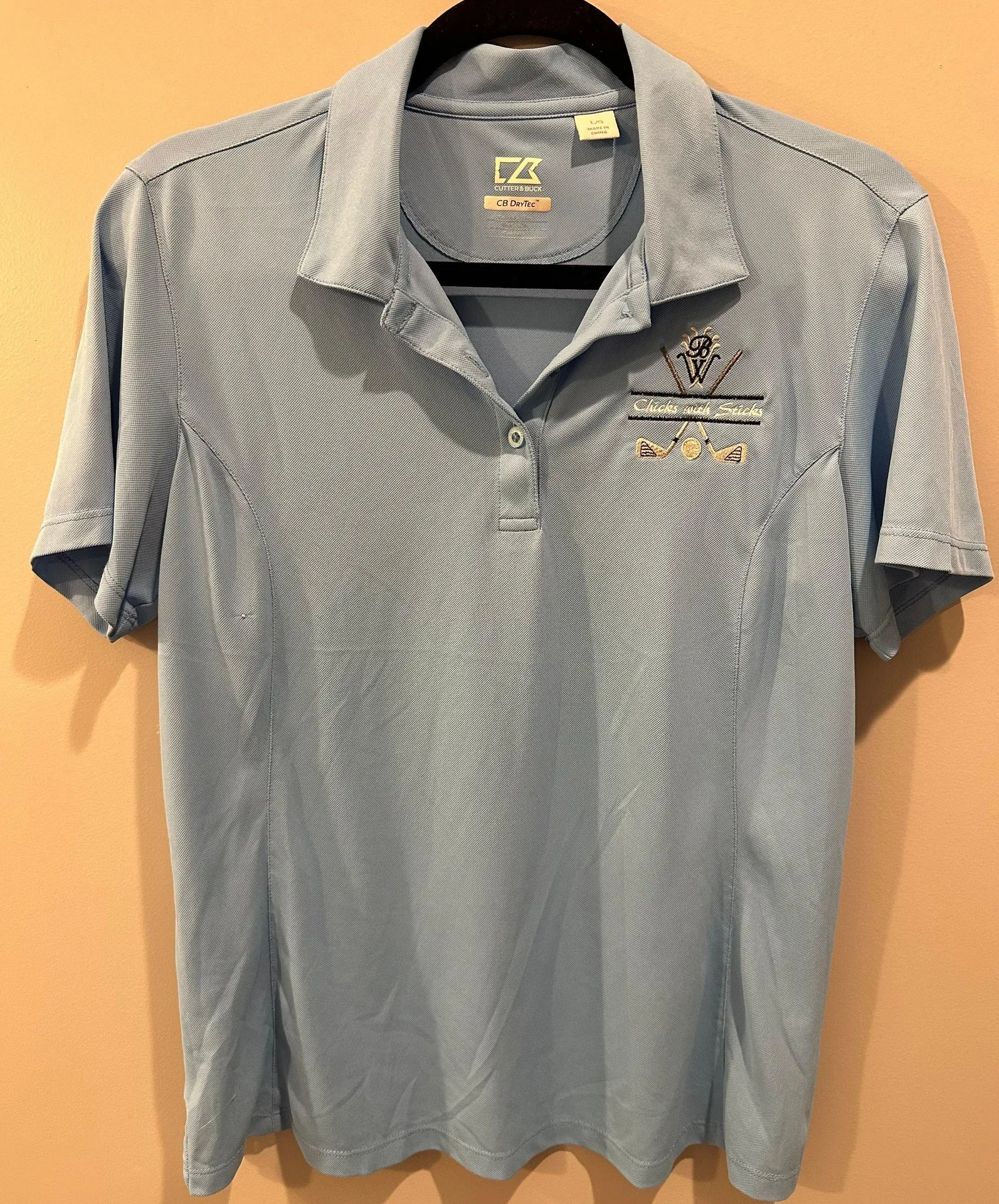 This DryTec embroidered polo golf top is by the brand Cutter and Buck in the size L and the color sky blue. Excellent condition. No noticeable flaws. Perfect for any women who enjoy golf or just with a skirt for an athleisure look.