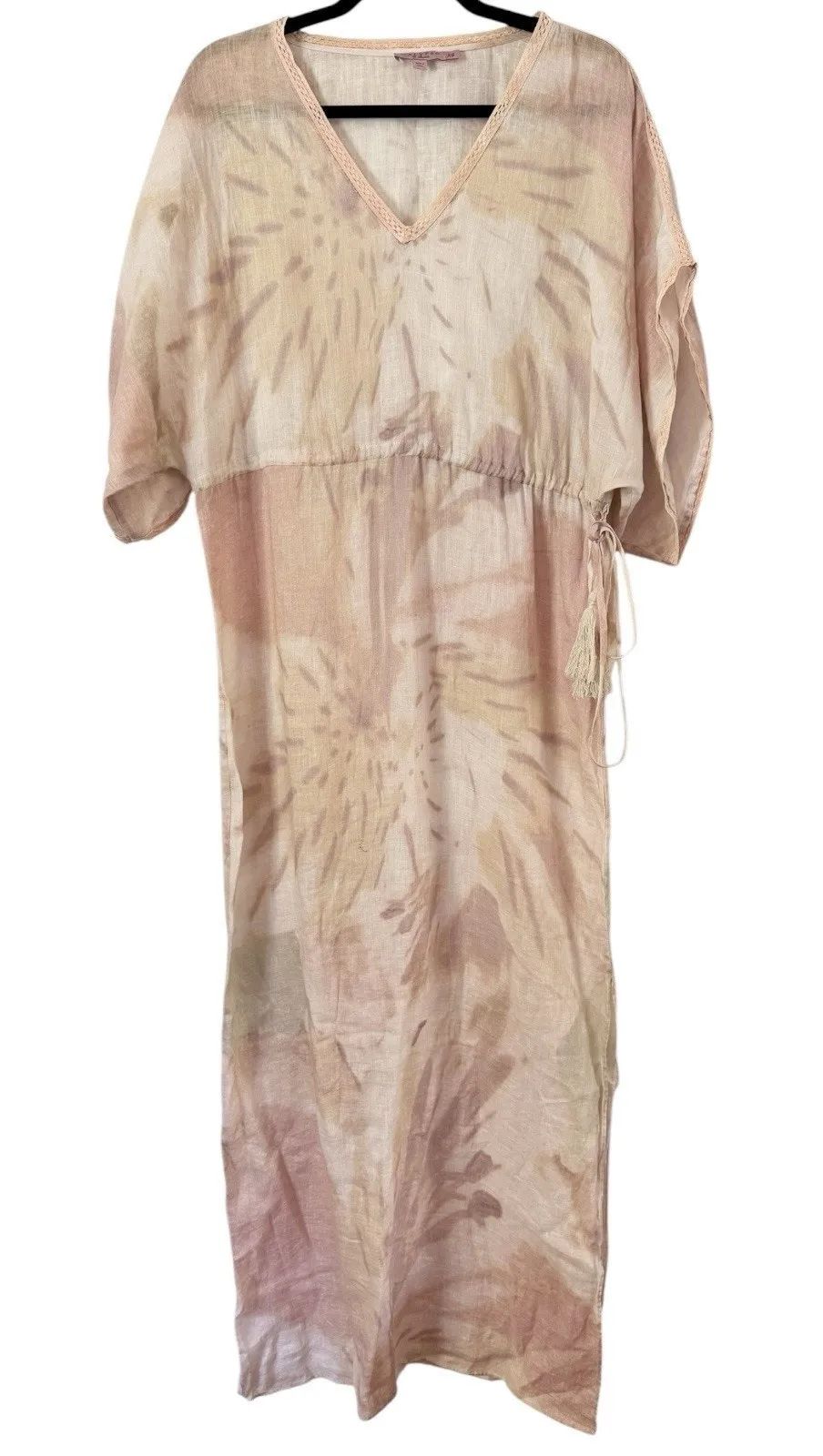 Calypso St Barth Marbled Tie Dye Linen Maxi Kimono Cover Up Dress. Lightweight and breathable 100% linen with an oversized fit and drawstring waistline. Neutral blush watercolor pastel tie dye print and high double side slits. Drawstring has tasseled details. Can be worn as a beach cover up or a dress. Women’s size XS Excellent condition! No rips, holes or stains! Measurements Chest 20” Waist 20” Length 58” Slits 21.5” Measurements are approximate and taken while laid flat. All preowned items are laundered per manufacturer specifications .