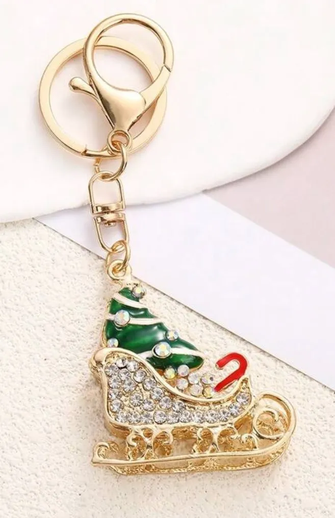 Brand new in a package Rhinestone sleigh with presence key ring/bag, charm Gold hardware key ring or lobster claw clasp for bag bling measures approximately 4 inches charm roughly measures approximately one and a half inches