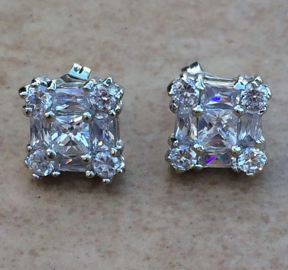 Rhodium plated square shaped stud earrings feature a cluster of princess cut, baguette and round CZ’s assembled into halo design. Posts with friction backs complete the look. Earrings measure 1/4 inch x 1/4 inch.