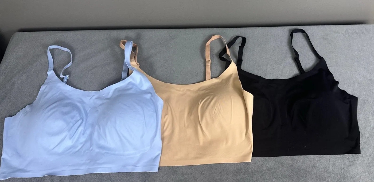 Listed is a lot of 3 Rhonda Shear Adjustable Strap Wireless Body Bra , size XL. Light blue, beige, a... Show more