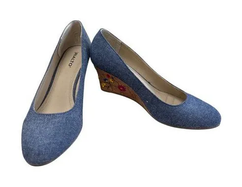 These Rialto pair is a Stylish and comfortable women's wedge heels featuring blue denim fabric and floral embroidery on cork wedges. Ideal for adding charm to casual or semi-formal outfits. They are in very good condition with no defects noted. I ship really fast. SKU 8247 • Denim fabric upper for a casual yet chic look • Cork wedge heels with floral embroidery detail • Lightly cushioned insoles for comfort • Heel height: 3 inches • Medium width fit No visible flaws or damage. Features: • Casual formal wear Size: 9.5M Condition: Pre-Owned Good This item has been cleaned, sanitized and deodorized. Although we clean our items additional cleaning may be needed such as spot treatments, etc.