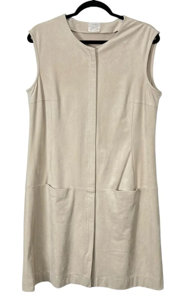 EUC RIANI Sleeveless Dress Apron Pockets Double Zip Taupe/Light TanTexture Feels Light Faux Suede, b... Show more