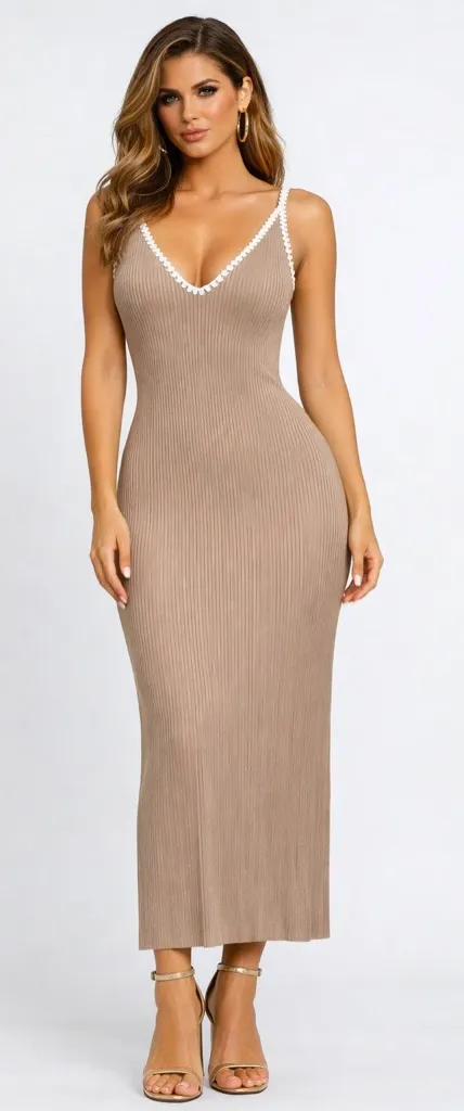 Effortless chic meets understated allure in this ribbed bodycon dress, a stunning piece designed to hug your curves in all the right places. The dress features a sophisticated V-neckline accentuated with a delicate crochet trim, adding a touch of bohemian elegance to its modern silhouette. The sleeveless design allows for versatile styling, perfect for layering or wearing alone on warmer days. This dress is ideal for a casual brunch, a stylish office event, or a romantic evening out. Style: Bodycon Dress Length: Midi Color: Beige Department: Women Sleeve Length: Sleeveless Pattern: Solid Occasion: Casual, Party/Cocktail Material: Knit Neckline: V-Neck Character: Minimalist, Bohemian, Chic, Neutral, Classic Fabric Type: Knit Season: Summer, Spring, Fall Sleeve Type: Strappy Sleeve Closure: Pullover Keywords: bodycon dress, ribbed dress, sleeveless dress, knit dress, neutral dress, beige dress, casual dress, womens fashion, midi dress, crochet trim, summer dress, vacation dress, tan dress, contemporary