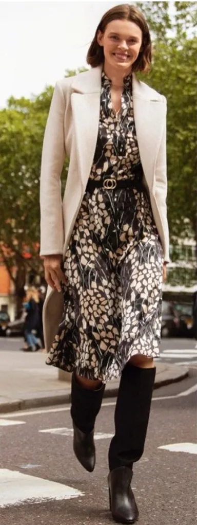Chic long sleeve dress with a stylish pattern. Ideal for versatile wear. Pair with boots or heels.