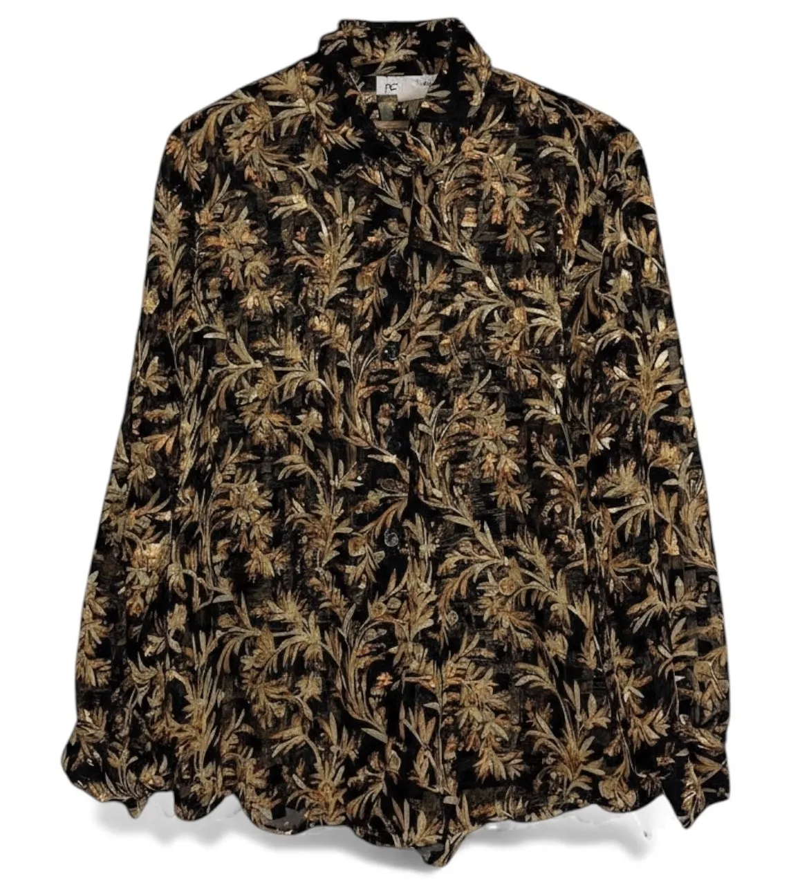 Drape yourself in the enchanting allure of this Richard Kristall blouse, a wearable work of art that whispers tales of sophisticated glamour. Its intricate floral tapestry, woven with threads of shimmering gold against a deep black canvas, creates a mesmerizing visual dance that captures the light with every movement. The sheer fabric offers a delicate allure, perfect for adding a touch of refined elegance to your ensemble. Imagine the envious glances as you grace a formal dinner or a chic evening out, feeling utterly captivating. This blouse also transitions beautifully to a stylish brunch or a refined cocktail party, ensuring you're always the epitome of grace. Measurements: • Armpit to Armpit: 24 inches • Length: F27 029 inches Type: Blouse Department: Women Material: Polyester Blend Neckline: Collared Sleeve Length: Long Sleeve Sleeve Type: Classic/Fitted Sleeve Pattern: Floral Accents: Button Theme: Bohemian, Elegant, Glamour Features: Sheer, Unlined, Button-Up, Collared Fit: Classic Keywords: Richard Kristall, Black Gold Floral, Sheer Blouse, Long Sleeve Shirt, Button Up Top, Women's Fashion, Elegant Top, Evening Wear, Occasion Blouse, Designer Shirt, Vintage Style, Romantic Blouse, Luxe Fabric, Artistic Print, Glamorous Top