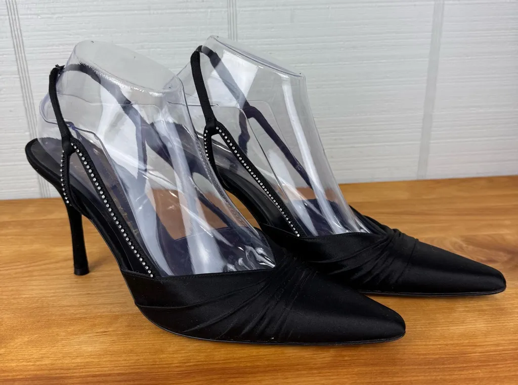 Richard Tyler black ruched satin pointed toe stiletto slingback heels with embellished rhinestone st... Show more