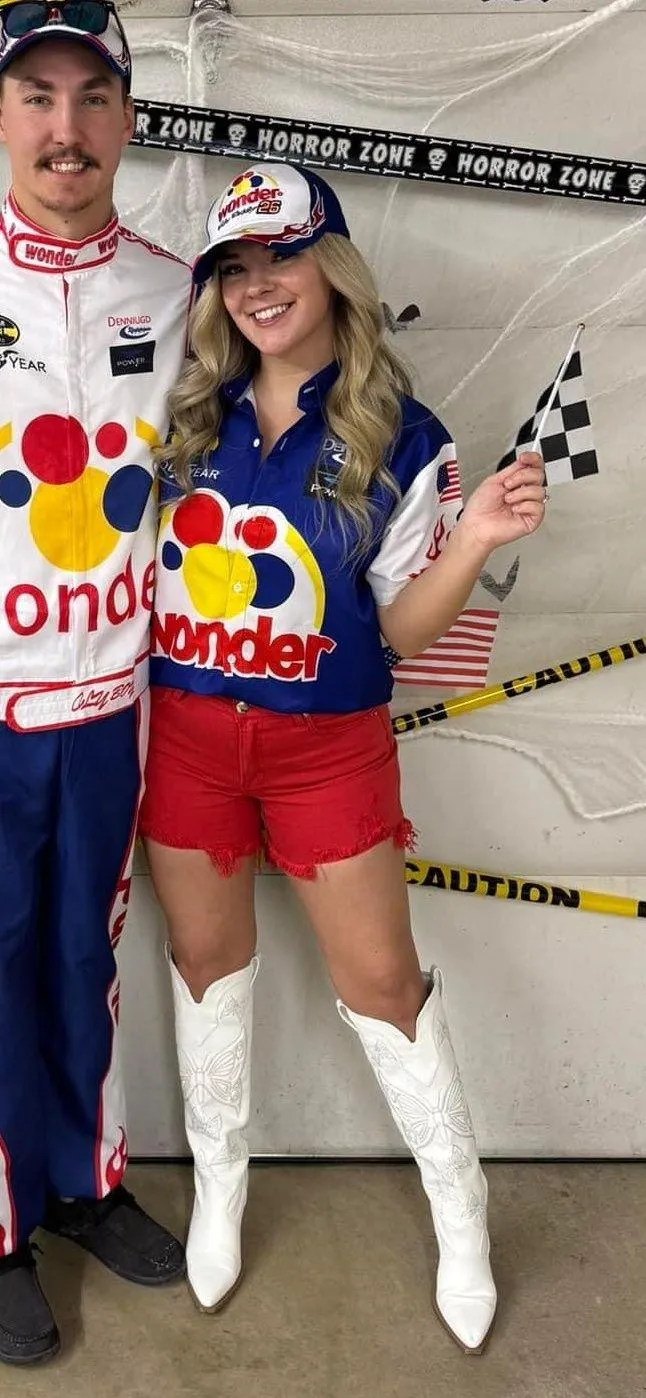Talledega Nights/Ricky Bobby Costumes. I have both costumes in this picture. Listing is for the one on the right. His costume is a large mine is a medium I wore it oversized. Includes everything except the boots and shorts. Can sell the boots separately if wanted