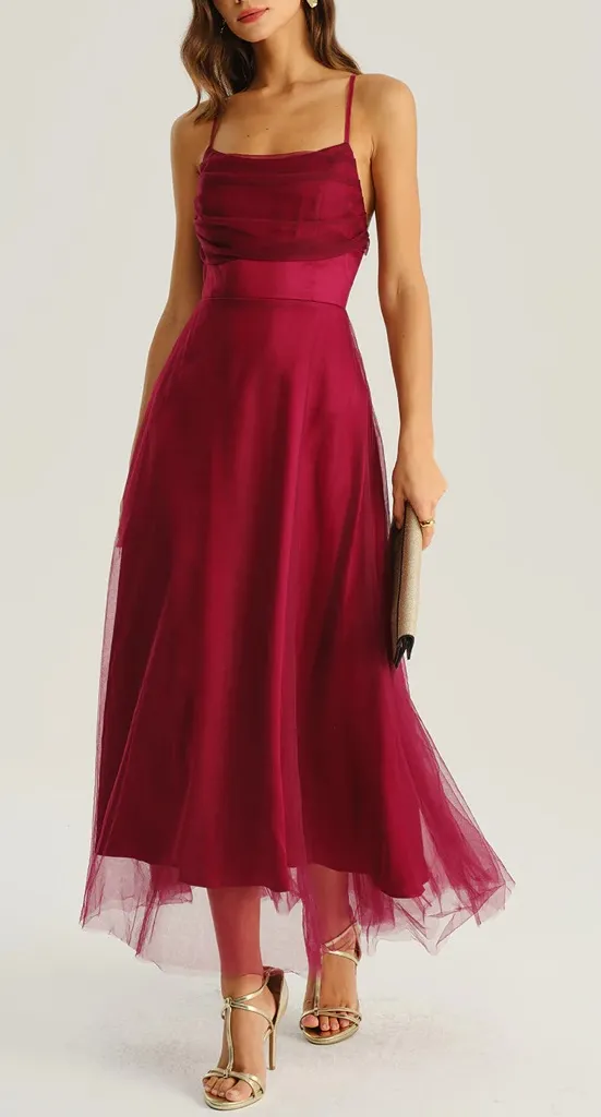 This wine red midi dress is an unforgettable choice for your next special occasion. It is designed to create a stunning formal look, blending luxury textures for a show-stopping effect. The sleek satin bodice provides a structured, natural waisted fit, leading to a dramatic X-cross back. This dress’s true 'wow' factor is the airy, pleated mesh skirt, which creates a flowy, ball gown silhouette that moves beautifully. As a non-stretch formal slip dress, this fully-lined piece ensures an elegant, defined fit for any wedding or black-tie event. - Occasion: special occasion - Style: Formal - Back Neckline: X Cross - Fabric Stretch: No Stretch - Waist: Natural Waisted - Sleeve Length: Sleeveless - Sleeve Type: Sleeveless - Pattern Type: Solid - Embellishment: Pleated, Zipper, Tie, Flowy - Dress Type: Slip - Silhouette: Ball Gown - Fabric: Polyester 95.0%, Spandex 5.0% - Material: Satin, Mesh