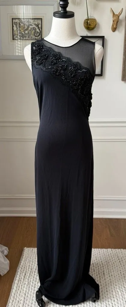 Remini by Shaw stretchy black sleeveless column gown with beaded lace embellishment running on an angle from one shoulder to opposite waist. Side zip closure. Tag size 8. Laying flat measures 16 inches armpit to armpit stretching to 19 inches without much resistance. 14 inches across the waist stretching to 16 without much resistance and 17 inches across the hip stretching to 22 inches. Approximately 62 inches shoulder to hem. Illusion neckline.