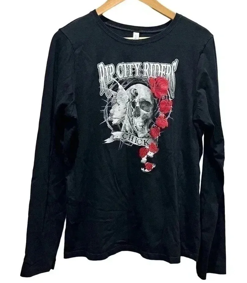 Bold RIP City Riders long sleeve graphic tee featuring a skull, fairy, and cascading red roses. Feminine biker energy with a goth-punk twist. Printed on a soft Bella+Canvas 100% cotton shirt. Pre-owned and well cared for—no stains, holes, or flaws. Ships within 1 business day. Size: Medium, Says 2X, but measures to a medium. Chest: 20" | Length: 26" | Sleeve: 26.5" Fabric: 100% Cotton Made in Honduras from USA components