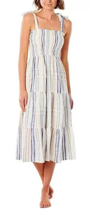 Great condition! 75% Cotton 25% Viscose This women's white and blue striped dress is from Rip Curl.... Show more