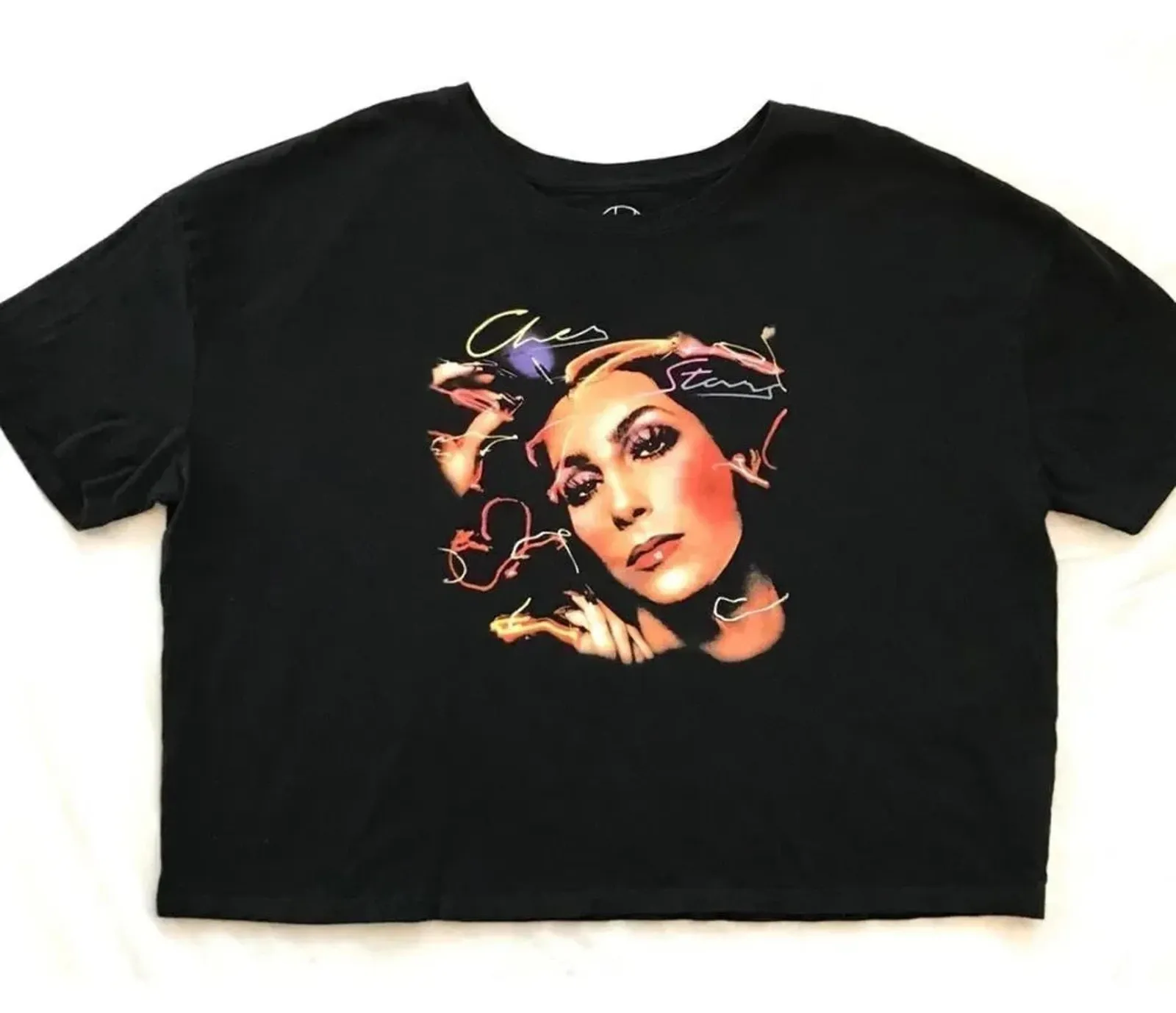 Cher Stars album cover art crop top shirt in black Size 2X 100% cotton light weight This a used shirt in like new condition Shirt has no stains, holes, or damage to stitching. Print in great condition. See photos for details.