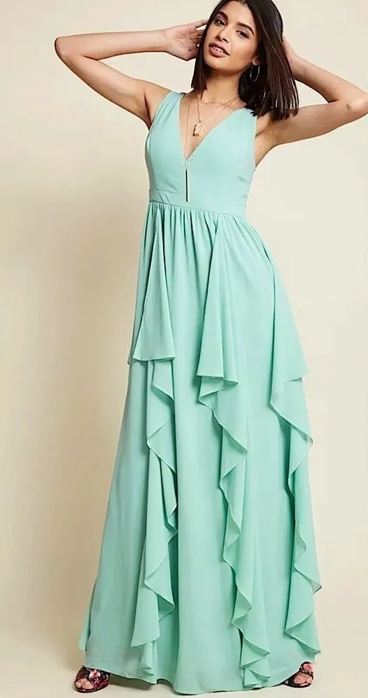 Lace & Mesh As Ruffles Ripple Dress. Fitted, high waist bodice with layers of ruffles flowing to the floor. Lightweight, flowy fabric. Pale, mint green. Called seafoam by Modcloth. Shell: 100% Polyester. Lining: 100% Polyester. Fabric does not stretch. Lining has stretch. Women’s Size small Approximate measurements are taken across the item laid flat: Bust: 18 inches Waist: 13.5 inches Length: 60 inches Clean, smoke-free home and studio. 5 star seller. Super fast shipping! Fairycore, Feminine, delicate, lace, girly, flowy, soft, romantic, dreamy, graceful, ethereal, coquette, ruffles, dainty SKU#B1005 21B