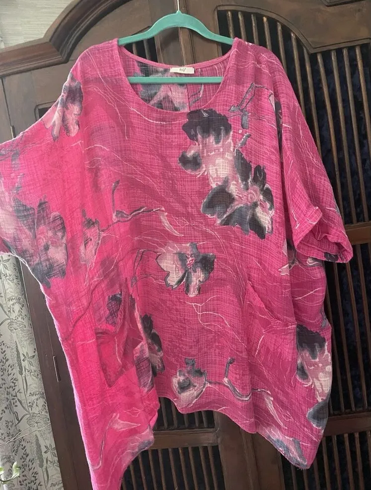 Brand: RIQ Size: One Size (fits M–L approximately) Material: 100% Cotton Color: Fuchsia Pink with Floral Print Country of Manufacture: Made in Italy Style Code: 11733 Details: Lightweight textured gauze cotton tunic with artistic floral pattern, round neckline, short sleeves, and two front patch pockets. Relaxed fit with soft drape, ideal for warm weather, travel, or beach days. Condition: Excellent pre-owned condition. Clean, bright, and well cared for. Style: Boho Italian tunic / resort casual top for effortless everyday wear.