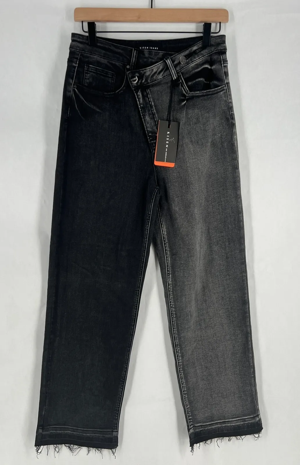 Description Risen Crossover Two Tone Jeans Womens 9 Black Gray Denim Cotton Straight Leg. Product Detail • Brand: Risen • Department: Women's • Color: Gray Black • Type: Jeans See photos for condition — I make sure to capture all details and imperfections.
