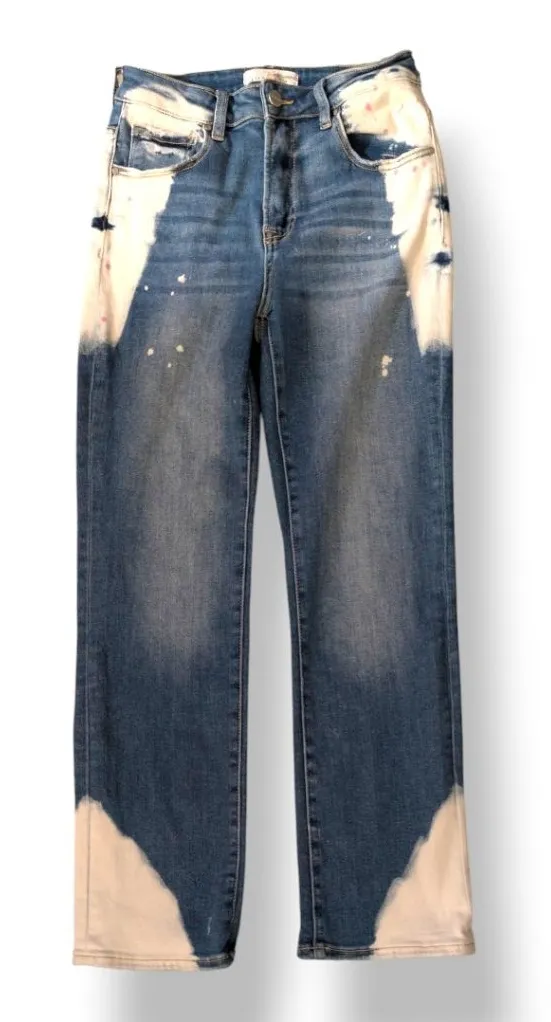 Risen Jeans Women's 5 / 27 Excellent used condition Risen High Rise Bleach Denim Jeans, which feature a unique two-tone design with white and pink paint splatters. They offer a high-rise, slim-fit silhouette and a straight leg design. RDP5473 Measurements upon request. risen jeans, bleach wash jeans, splatter denim, skinny jeans, mid rise jeans, stretch denim, womens jeans size 5, size 27 jeans, street style denim