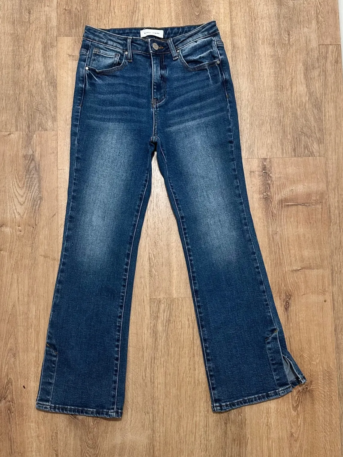 Elevate your denim collection with these chic RISEN JEANS. The vibrant blue wash and flattering high-rise silhouette create a long, lean line, while the modern flare leg adds a touch of retro flair. The stylish cropped length and subtle side slits at the hem offer a contemporary edge, perfect for showcasing your favorite footwear. These jeans are ideal for a casual day out or a night on the town. - preowned, excellent used condition Keywords: high rise, flare, cropped, distressed, contemporary, fashionable, streetwear, denim, blue jeans, stylish, casual wear, trendy