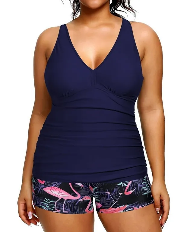 Go for a quick dip in the ocean with this tummy-control tankini swimsuit with a twisted front. This tankini is designed with an elegant twisted front detail to show off your neckline and flatter your figure while offering moderate coverage for your days by the water. Over-the-shoulder straps and removable soft cups will provide you with secure support so you can enjoy all of your beach activities. With a deep v-neckline for both sporty and feminine touch and wider adjustable straps to keep you supported, this bathing suit is totally what you need. Matching with a floral short make this versatile tankini a must-have for anyone on the go. Features & Details Floral print High elasticity Skin-friendly 4 Way Stretch Wirefree comfort Deep v neckline Cross over front Plus Size Tankini with Shorts A removable padded bra Adjustable shoulder straps Ruched tummy control The high-waisted bottom Full back coverage Flattering V neckline Soft Touch Comfort Fabric V-neck tankini top in solid Matching floral shorts Tankini Top with Twisted Front 85% Nylon/ 15% Spandex Adjustable Straps for Comfort Plus Size V-Neck Tankini Swimsuit Made to withstand long hours in the water Solution swimwear designed by women for women Soft touch, high stretch swim fabric with front ruching Machine or hand wash. No bleach. Line dry Box # 84 Item # 0450