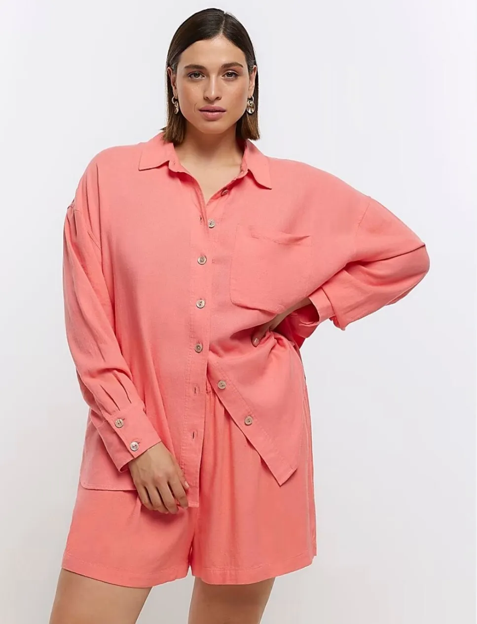 NEW WITH TAGS SIZE US LARGE Discover effortless chic with this River Island oversized shirt. Crafted from a breathable linen blend, its relaxed silhouette drapes beautifully, offering both comfort and style. The soft pink hue radiates a cheerful vibe, while the classic button-front design and chest pocket add a touch of timeless sophistication. Button cuffs on the long sleeves allow for versatile styling, perfect for a casual day out or a relaxed evening. Measurements: • Pit to Pit: 25 in • Shoulder to Hem Length: 30 in • Sleeve Length: 23 in Type: Button-Up Department: Women Style: Basic Material: Viscose, Linen Neckline: Collared Sleeve Length: Long Sleeve Sleeve Type: Classic/Fitted Sleeve Pattern: Solid Accents: Button Features: Oversized, Pockets Fit: Relaxed Keywords: linen blend, oversized fit, button up, long sleeve, pink, plus size, casual wear, summer style, resort wear, loungewear, beach cover up, relaxed fit, lightweight