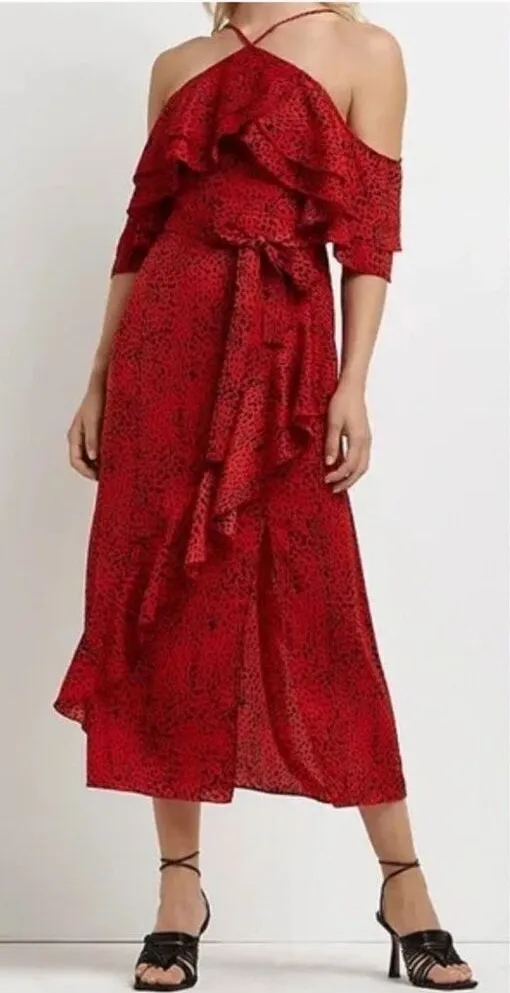 River Island red ruffled animal print cold shoulder midi dress 10 . This dress is NWT, however it do... Show more