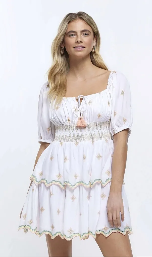 This is a River Island boho-style mini dress in size Small. Crafted from lightweight white fabric, it features delicate multicolor embroidery, puff sleeves, and a smocked waist that flatters the figure. The dress includes a square neckline with a tasseled tie front and tiered scalloped hems with colorful trim for a playful finish. • Brand: River Island • Size: Small • Color: White with multicolor embroidery • Style: Boho mini dress • Features: Puff sleeves, smocked waist, tassel tie front, scalloped hem • Condition: Excellent pre-owned condition Perfect for summer outings, vacations, or weekend brunches. MSRP $45