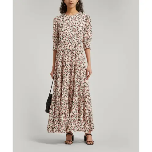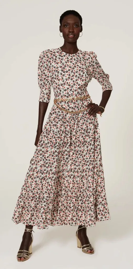 Gorgeous rayon floral dress by RIXO. “Kristen” style in "Shell Squiggle Coral", an off-white / ecru drapey viscose featuring a coral & shell pattern in orange & black. Elbow length puffed sleeves and very full tiered / ruffled skirt. Bust 40“, waist 32“, length 57“. Size M / US 8 / UK 12, great preowned condition - some faint discoloration at underarms and vertical thread pull on front bodice (see photos, not at all noticeable when worn). All measurements taken with garment lying flat & doubled where applicable. "A crepe tea-dress with vibrant print that embodies RIXO’s glam-rock aesthetic. Every RIXO piece is a bold statement. The Kristen dress is printed with a whimsical, painterly pattern of coral and shells. Featuring billowing cropped sleeves and a silhouette-skimming bias cut, pair with strappy black heels for dramatic evening style. Closed back No split True waist Full skirt Round neck 100% Viscose Dry clean only" 12345
