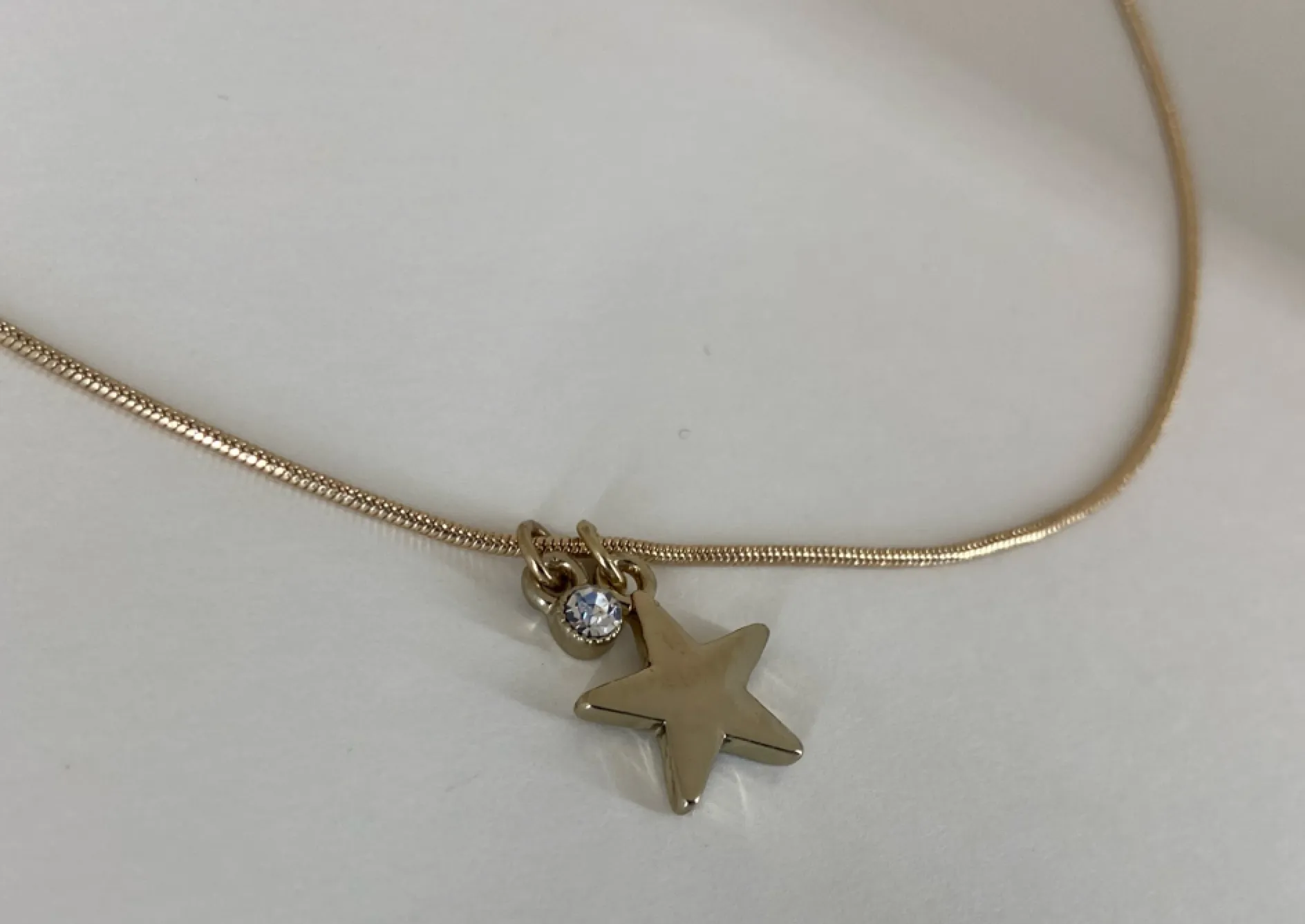 2 charms: Solid Gold Tone Star is approx 3/4” in length with bail Smaller charm is One round looking diamond (crystal) to add dimension and character. Gold Tone metal omega style chain measures 16” in length plus a 3” extender chain. Lobster Claw Clasp. Extender Chain has a charm with RJG monogram on one side and CN on the other side. New. Never worn. New without tag.