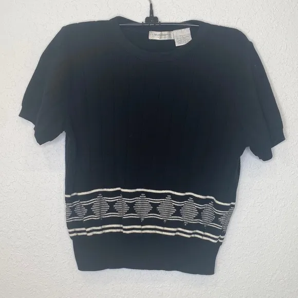 Liz Claiborne petite collection black & white striped & geometric hem design short sleeve knit sweat... Show more