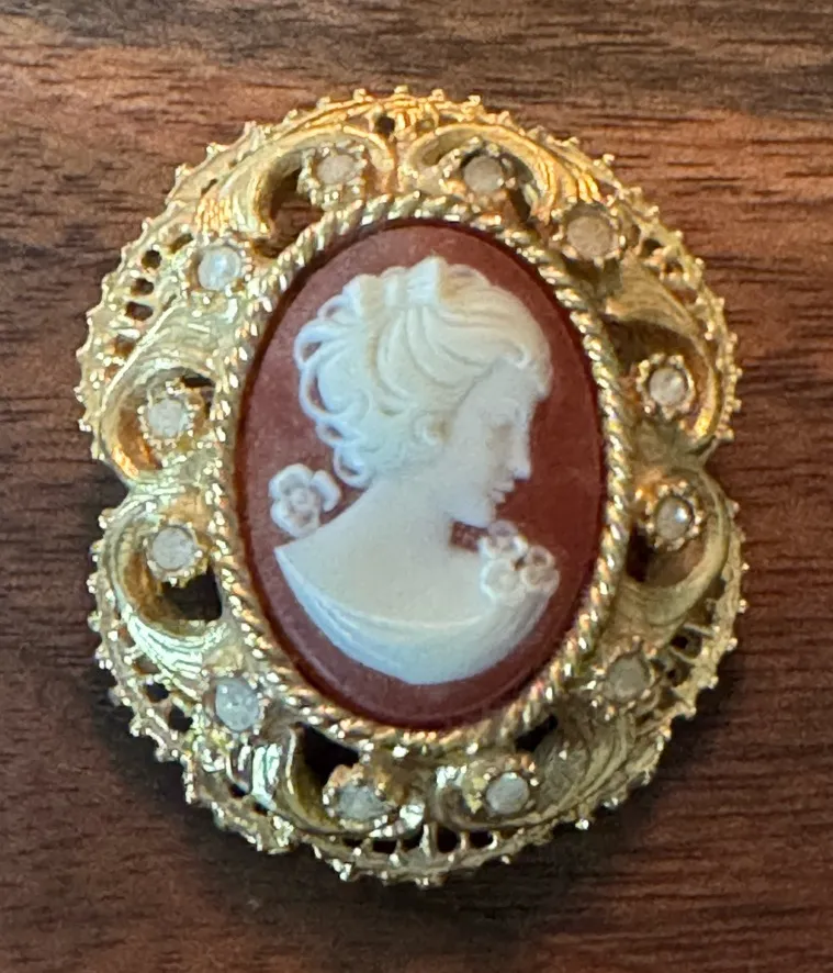 R.J.Graziano Ornate Cameo and Austrian Crystal Gold Plated Brooch and Pendant 2" Pink - $40 - From Cari