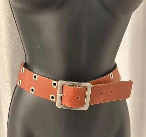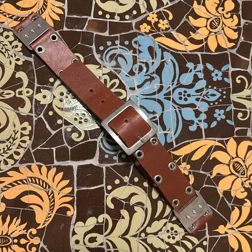MR. CAT LEATHER BELT WITH SILVER TONE ORNAMENTATION. SZ: 38” Tan - $65 - From Whimsical