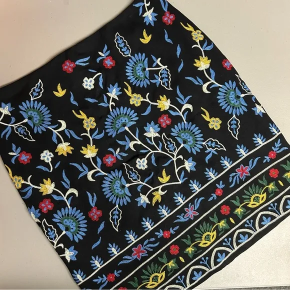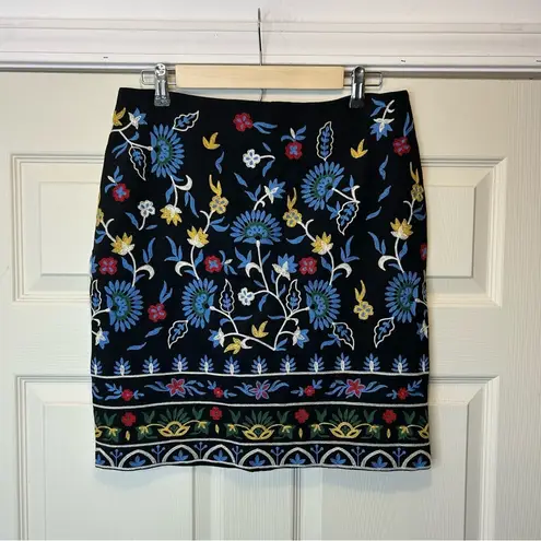J McLaughlin Pencil Skirt Black Floral Embroidered Back Zip Womens Size 8 Measures approx. 16“ across the waist x 20“ top to bottom hem. In great preowned condition. No flaws to note. Comes from a clean and smoke free home!