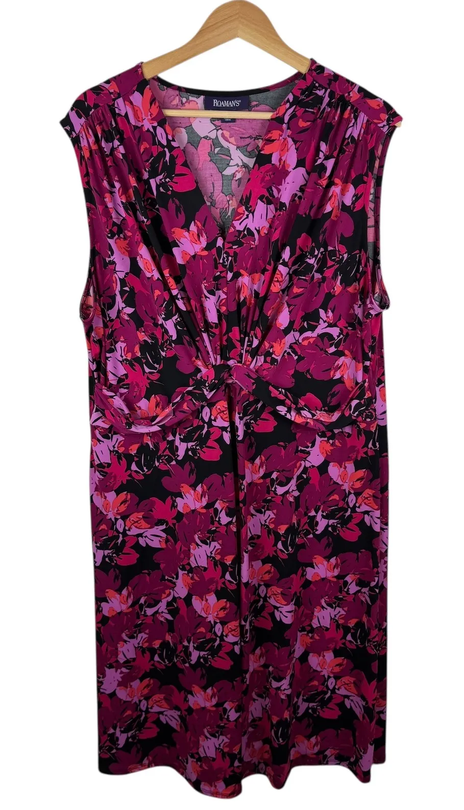 Vibrant floral dress with a striking magenta and pink flower design on a black background. This stylish dress features a flattering V-neckline and a unique twist-front detail at the waist, creating a defined silhouette. The sleeveless design makes it perfect for warm weather, while the comfortable, stretchy fabric ensures a great fit. Pair this dress with sandals for a casual brunch or dress it up with heels for a garden party or a special occasion. Style: A-Line Dress Length: Midi, Knee Length Color: Pink Department: Women Sleeve Length: Sleeveless Pattern: Floral Occasion: Party/Cocktail, Casual Material: Polyester, Spandex, Polyester Blend Neckline: V-Neck Character: Flower, Magenta, Pink, Floral, Twist Fabric Type: Knit Season: Summer, Spring Sleeve Type: Cap Sleeve Keywords: Roaman's, Floral dress, Midi dress, Plus size dress, Sleeveless dress, Twist front dress, Magenta dress, Pink dress, Black floral dress, Womens dress, Summer dress, Casual dress, Party dress, V neck dress, Sleeveless, Twist Front, Stretchy, Casual, Vacation, Cruise, Summer, Resort, Evening, Comfortable, Bold Print, Feminine Excellent Pre-Owned Condition (see pics for details) Flaws: No visible flaws. Measurements: included in photos. Please compare the measurements to something you already own for a great fit! Fast shipping: Shipped out next business day! Please let us know if you have any questions!