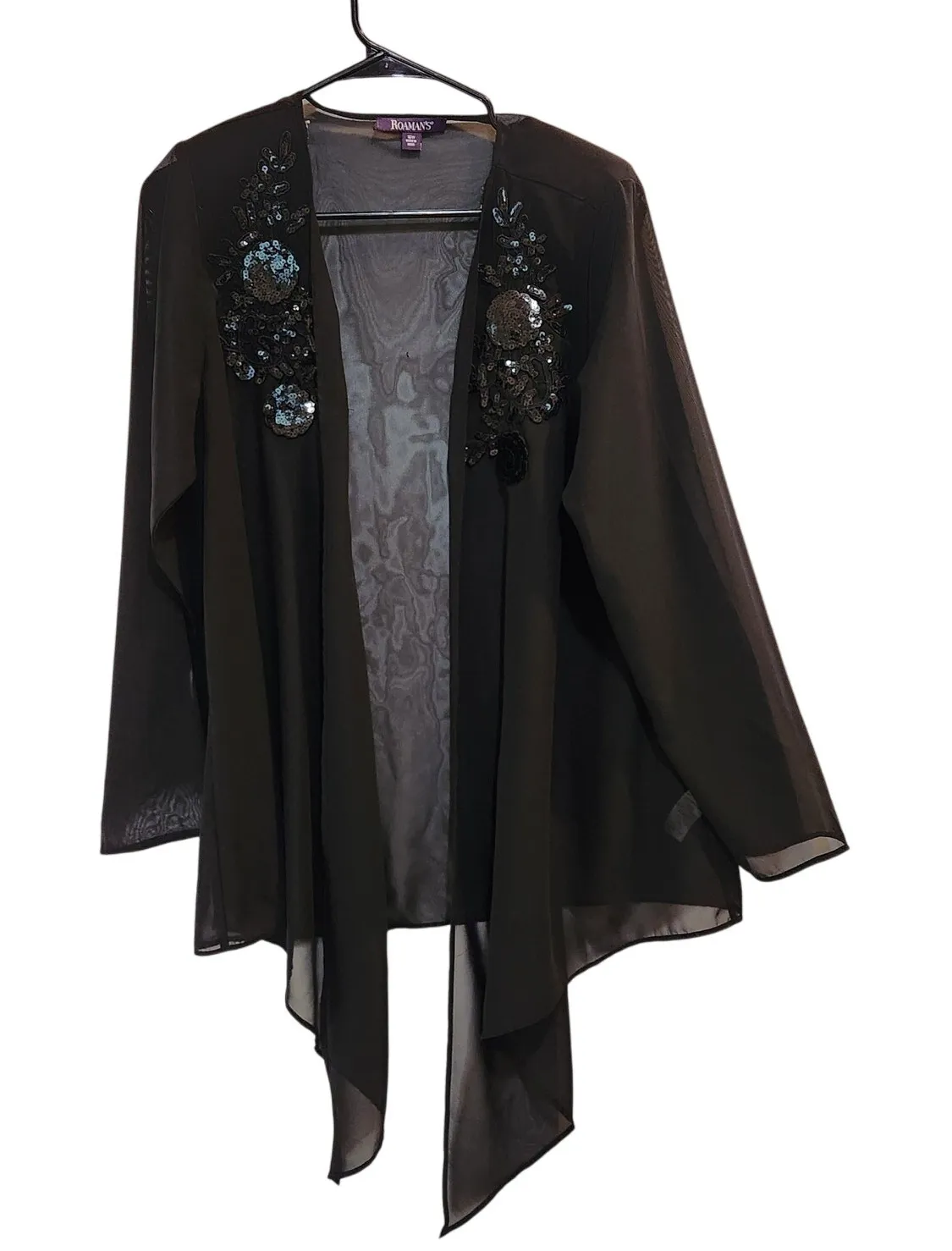 Great used condition The matching dress is also available in my store, listed separately. Add a touch of vintage glam to your wardrobe with this Roaman’s sheer black cardigan shawl, adorned with delicate floral embellishments and a flowy open-front design. Perfect as an eveningwear layer or statement piece, it channels retro 90s elegance with effortless sophistication. 90s retro vintage eveningwear gothic glam layering statement romantic chic eventwear timeless feminine elegancecore