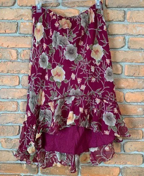 Robbie Bee Petite midi skirt in a striking burgundy hue adorned with a vibrant floral print. This skirt showcases a chic layered ruffle hemline, adding a touch of playful movement and dimension. The design incorporates a flattering silhouette perfect for various styling options. Keywords: floral print, ruffle hem, midi length, silk skirt, petite sizing, bohemian, feminine, vintage inspired, layered skirt, burgundy, nature inspired, charming, flowy A couple of snags otherwise very good condition. Measurements are approximate. Pit-to-pit: 14.25" Length: 22" - 30" Open to offers!