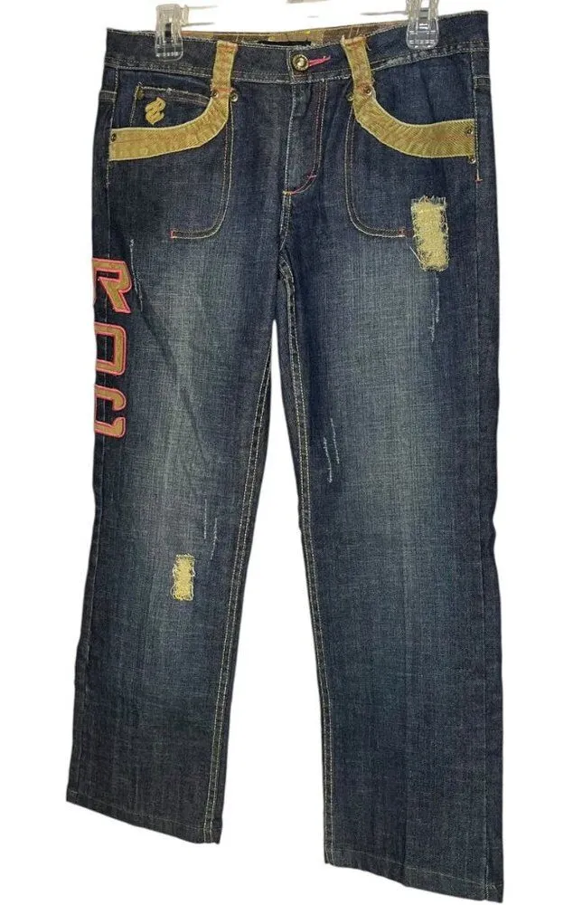 Y2K Roca Wear Women's 9 Jeans Blue Denim Pink Tan Corduroy Spell Out Distressed Size 9 Waist: 32.75... Show more