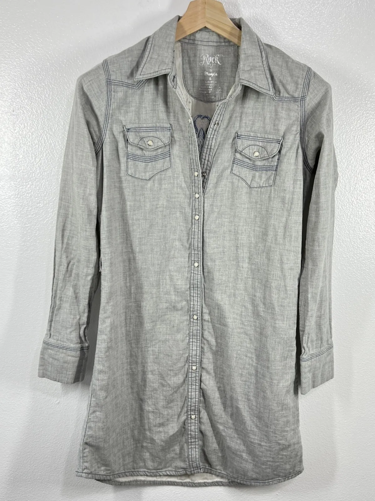 Style: Shirt Dress Dress Length: Short Color: Gray Department: Women Pattern: Solid Occasion: Casual Sleeve Length: Long Sleeve Material: 100% Cotton Neckline: Collared Fabric Type: Denim Character: Cowgirl, Rodeo, Western Season: Fall, Spring, Summer, Winter Closure: Button Rock 47 by Wrangler, shirt dress, western dress, cross embroidery, long sleeve dress, gray dress, small dress, cotton dress, button down dress, I ship out items Monday - Friday. • All items come from a pet-free, smoke-free home. • Please compare the measurements to something you already own. Thank you for visiting my store.