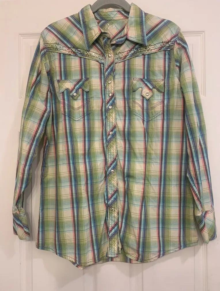 Rock 47 By Wrangler Western Button Up. Women’s Green Pink Blue & Brown Plaid with Pearl Snap Buttons. Dual flap snap chest pockets. Brown embroidered across upper chest and embellished with clear stones. In great condition. Size: XL Measurements are taken laid flat 23.5” armpit-armpit 21” armpit-hem 25.5” sleeve #western #rodeo #countyfair Stylish multicolor plaid button-up shirt with lace details. Perfect for casual wear.