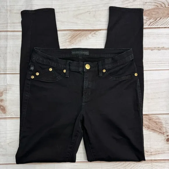 Rock & Republic “Kashmere” black skinny jeans with gold tones buttons and grommets. Women’s size 10... Show more