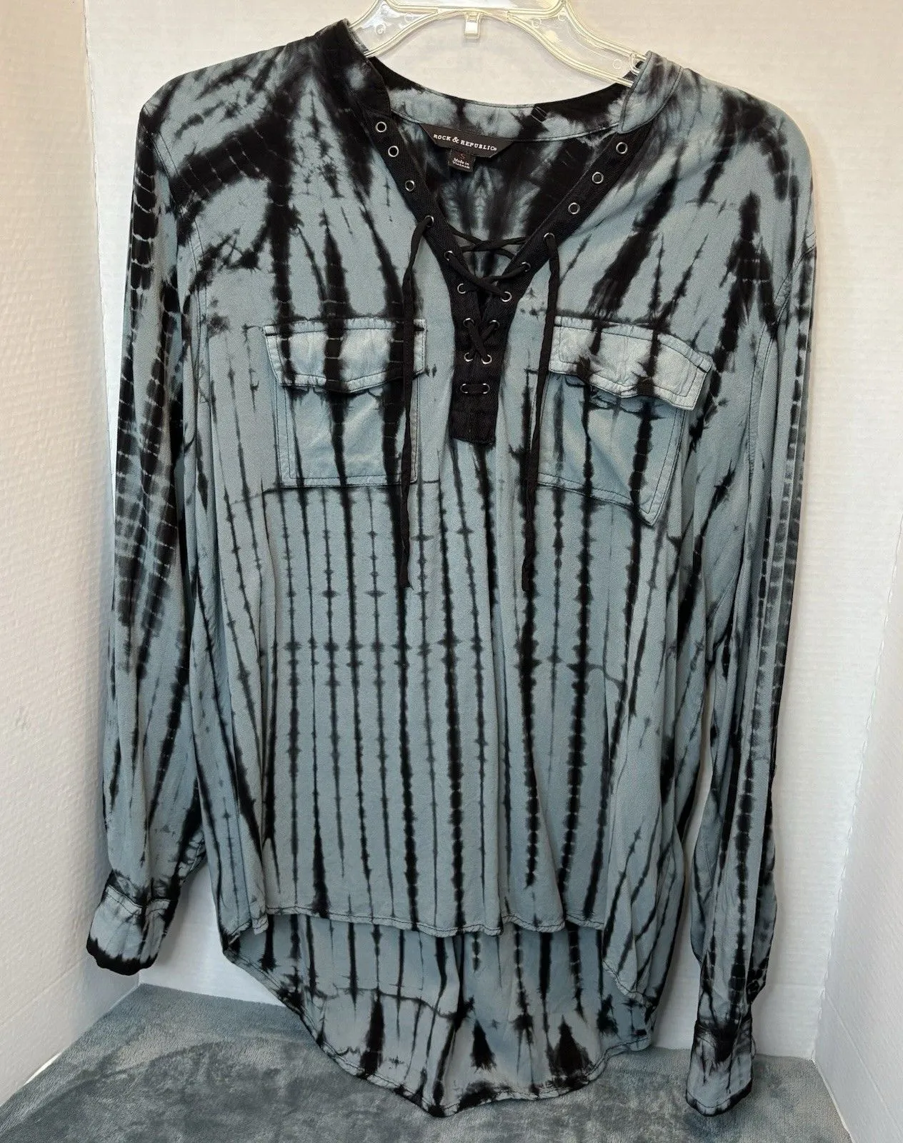 The Rock & Republic Sage and Black lace up blouse in size small is a stylish and edgy piece perfect... Show more