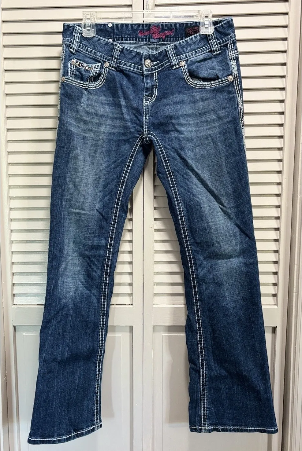These Rock & Roll Cowgirl Bootcut Denim Jeans are a stylish and versatile addition to any woman's wardrobe. Featuring a low rise at 7" and a 5-pocket design, these jeans are both flattering and functional. They have a 30" waist and 31" inseam. The bootcut style and slimming features make them a great choice for all seasons, while the embroidered gems and beaded accents add a touch of flair. Made from a comfortable and stretchy denim fabric, these jeans are easy to care for and perfect for everyday wear. Show off your unique style with these trendy and eye-catching jeans from Rock & Roll Cowgirl. ***Stain on back pocket-pictured *** (B1006)