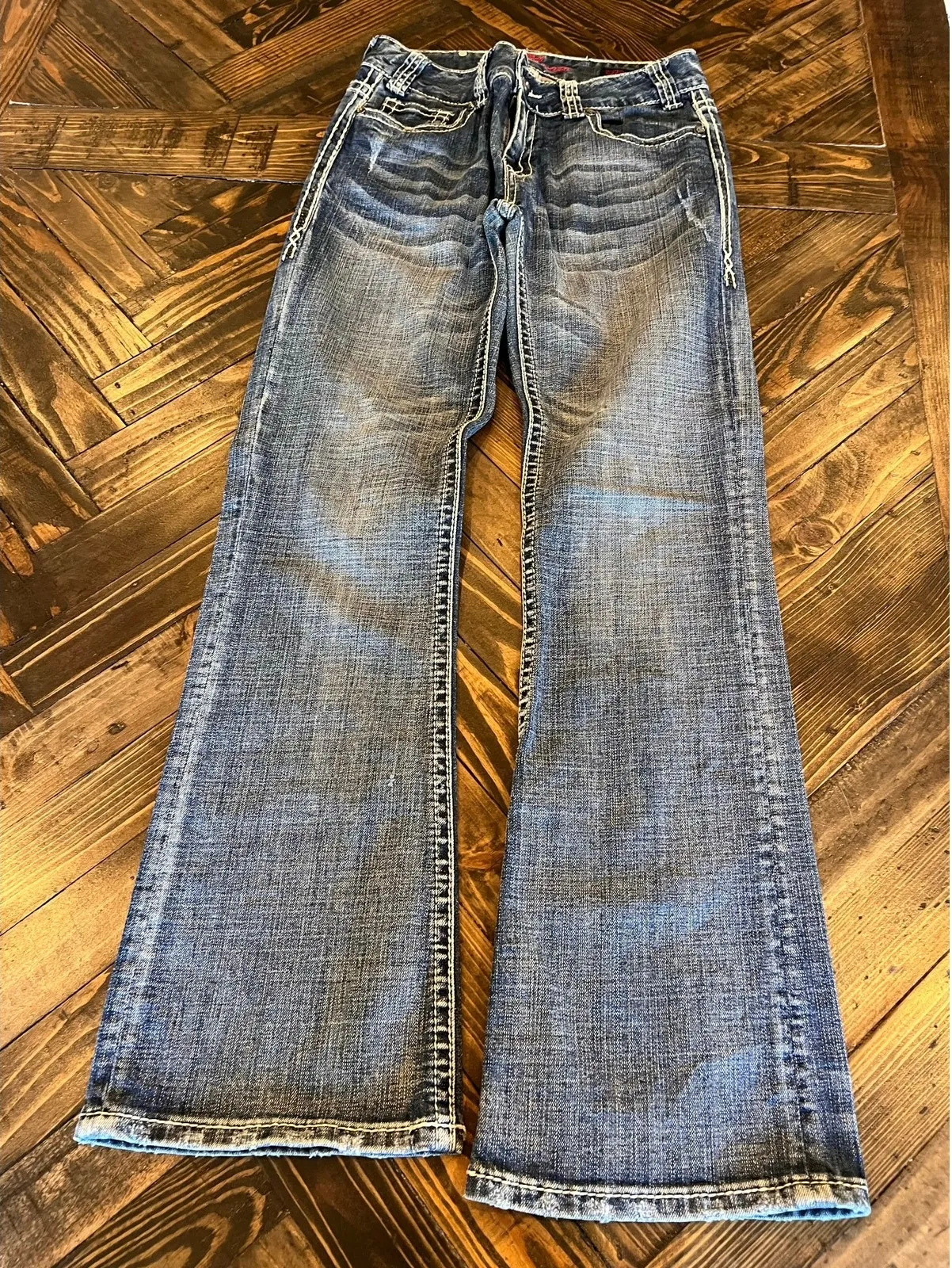 Good Condition- Pre-owned Note as pictured: some rhinestones on pocket are missing Jean Measurements as pictured: Side to side: 13.5 inches Waist: 27 inches Inseam: 31 inches Rise: 9.5 inches Top to bottom: 39 inches Fast Shipping!