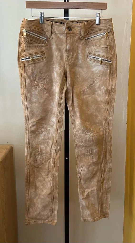 Tan / gold jeans with distressing and zipper accents. MSRP $195 New without tags! Never worn.... Show more