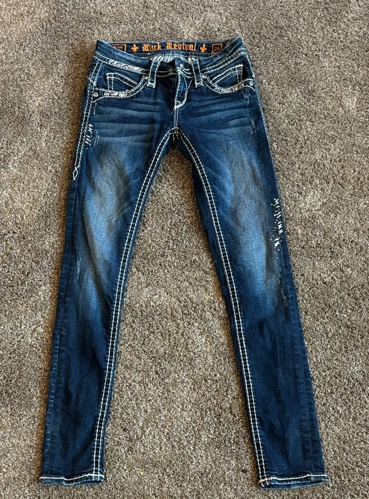 Indigo skinny jeans with contrast stitching. Rock Revival branding. Perfect for everyday style.